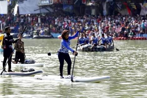 Hari ini, Susi dan Sandi beradu kecepatan di Danau Sunter. Susi berdayung dengan “paddle board,” sementara Sandi berenang, akhirnya Menteri Susi menempati memenangkan adu kecepatan