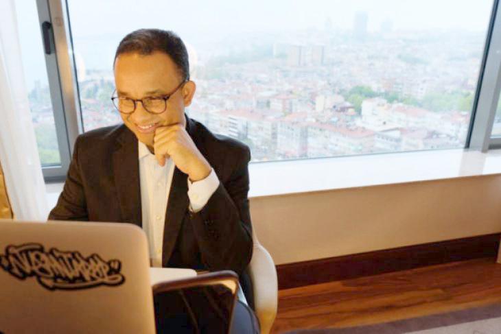 Berlatar pemandangan kota dari jendela kamar hotel tempat dia menginap di Istanbul, dengan laptop ditaruh pada koper dan lampu-lampu kamar hotel disorotkan ke arahnya, Anies berkomunikasi dengan Sandiaga dan perangkat daerah yang berada di ruang Smart City, Balaikota DKI Jakarta.