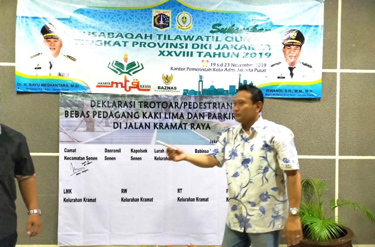 Sementara Camat Senen, Rony Jarmiko mengatakan, deklarasi serta penandatanganan oleh warga merupakan bagian sangat penting bagi pemerintah atas dukungan partisipatif warga menjaga sterilitas trotoar yang nantinya menjadi lebih apik.