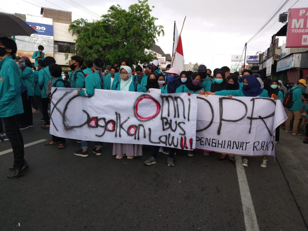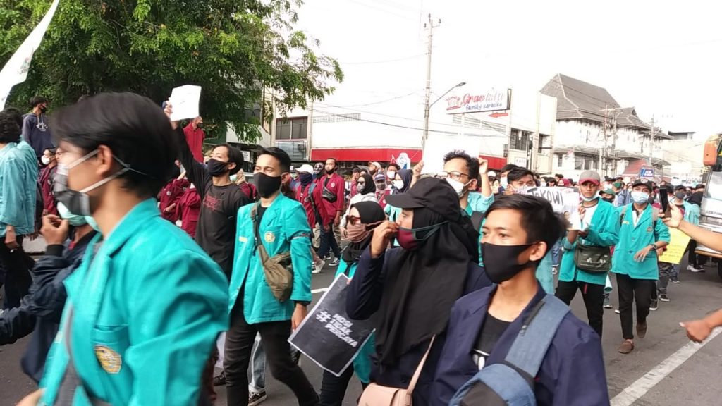 Sukoharjo, sketsindonews – Sejumlah Mahasiswa memadati prempatan pasar Kartasura, Sukoharjo, Jawa Tengah, Kamis (08/10/20).