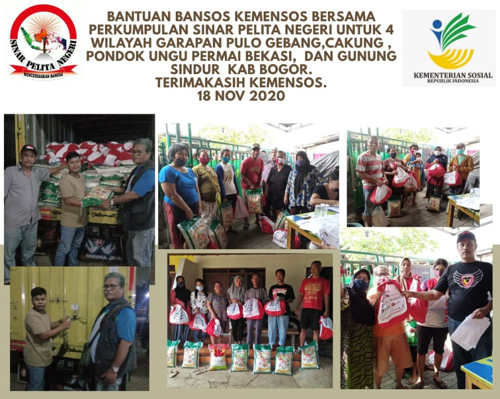 “Pembagian Bantuan Sosial dari Kemensos Melalui Perkumpulan Sinar Pelita Negeri, 500 Paket Bansos untuk Tanah Garapan Pulo Gebang, 135 Paket Bansos untuk Warga Cakung, 300 Paket Bansos untuk Warga Bekasi Pondok Ungu Permai, 250 Paket Bansos untuk warga Gunung Sindur Bogor,” papar Lenny saat dihubungi, Senin (23/11/20).