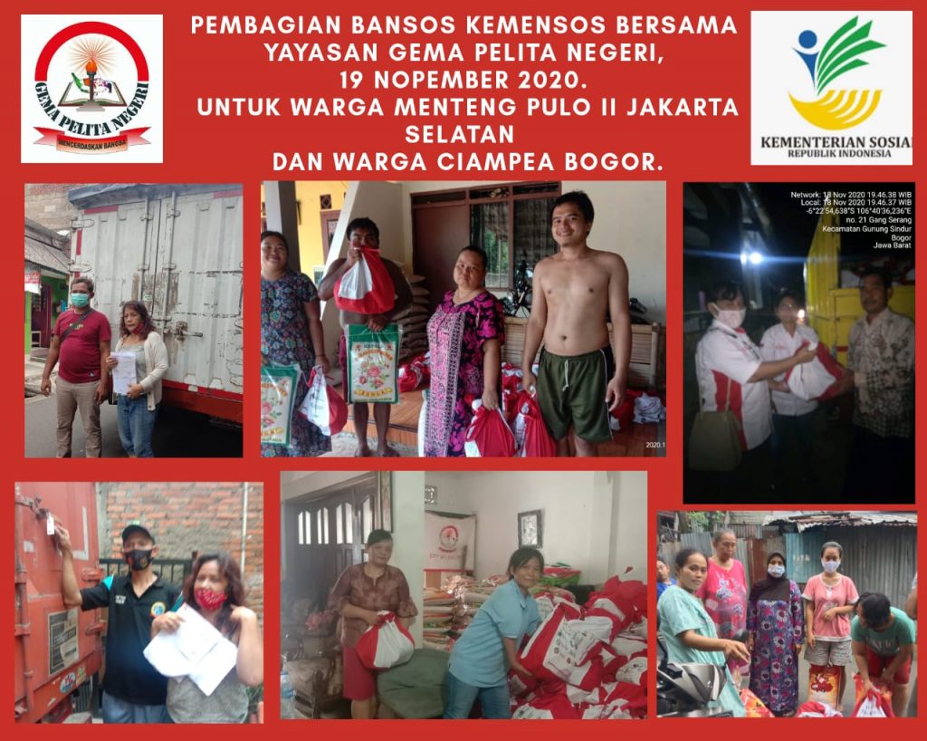 “Pembagian Paket Bantuan Sosial Kemensos Melalui Yayasan Gema Pelita Negeri 500 Paket Bansos untuk Warga Menteng Pulo II, 210 Paket Bansos untuk Warga Ciampea Kabupaten Bogor,” paparnya.
