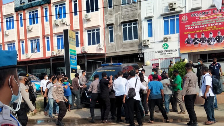 Aparat kepolisian Bintan yang berjaga di kantor kejari Bintan dan di bantu oleh beberapa Anggota TNI dengan sigap langsung managamankan masa yang anarkis.