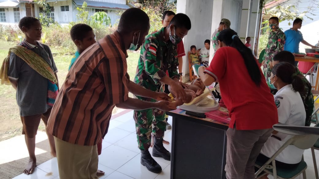 Jakarta, sketsindonews – Dalam upayanya untuk menjaga dan meningkatkan derajat kesehatan generasi penerus bangsa di perbatasan RI-PNG, Pos Iwur Satgas Yonif 403/Wirasada Pratista bekerjasama dengan Puskesmas Iwur menggelar Posyandu di Kampung Iwur, Distrik Iwur, Kabupaten Pegunungan Bintang, Papua.