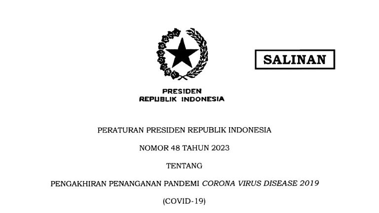 Pemerintah mengeluarkan Peraturan Presiden Republik Indonesia (Perpres) Nomor 48 Tahun 2023 tentang Pengakhiran Penanganan Pandemi Corona Virus Disease 2019 (COVID-19). Peraturan tersebut diterbitkan sejalan dengan status pandemi COVID-19 yang telah dinyatakan berakhir dan status faktual COVID-19 telah berubah menjadi penyakit endemi di Indonesia.