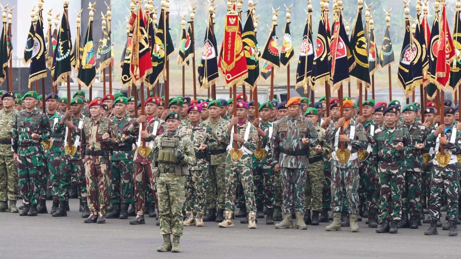 Panglima TNI Jenderal TNI Agus Subiyanto bersama Menteri Pertahanan RI Sjafrie Sjamsoeddin dan para Kepala Staf Angkatan meninjau langsung pelaksanaan geladi bersih Upacara Gelar Pasukan Operasional dan Kehormatan Militer di Lapangan Udara Suparlan, Pusdiklatpassus, Batujajar, Kabupaten Bandung Barat, Jumat (8/8/25).