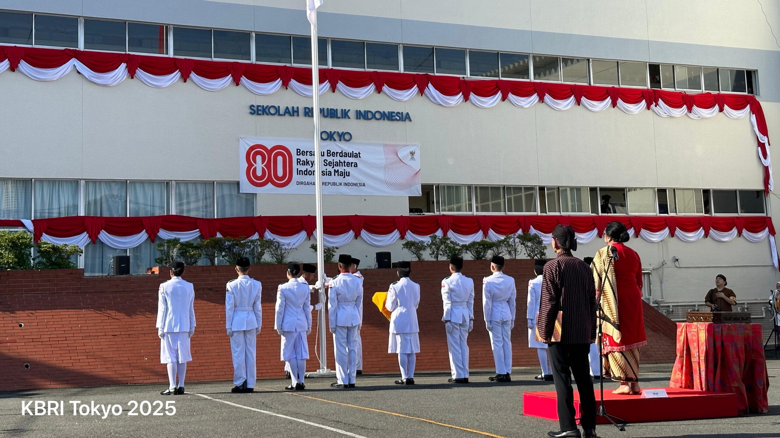 Di tengah cuaca panas kota Tokyo yang menyengat, sekitar 500 WNI dari berbagai kota di Jepang untuk kali pertama mengikuti Upacara Pengibaraan Bendera HUT ke-80 RI yang diadakan oleh KBRI Tokyo di Sekolah Indonesia Tokyo, Minggu, (17/8/25)
