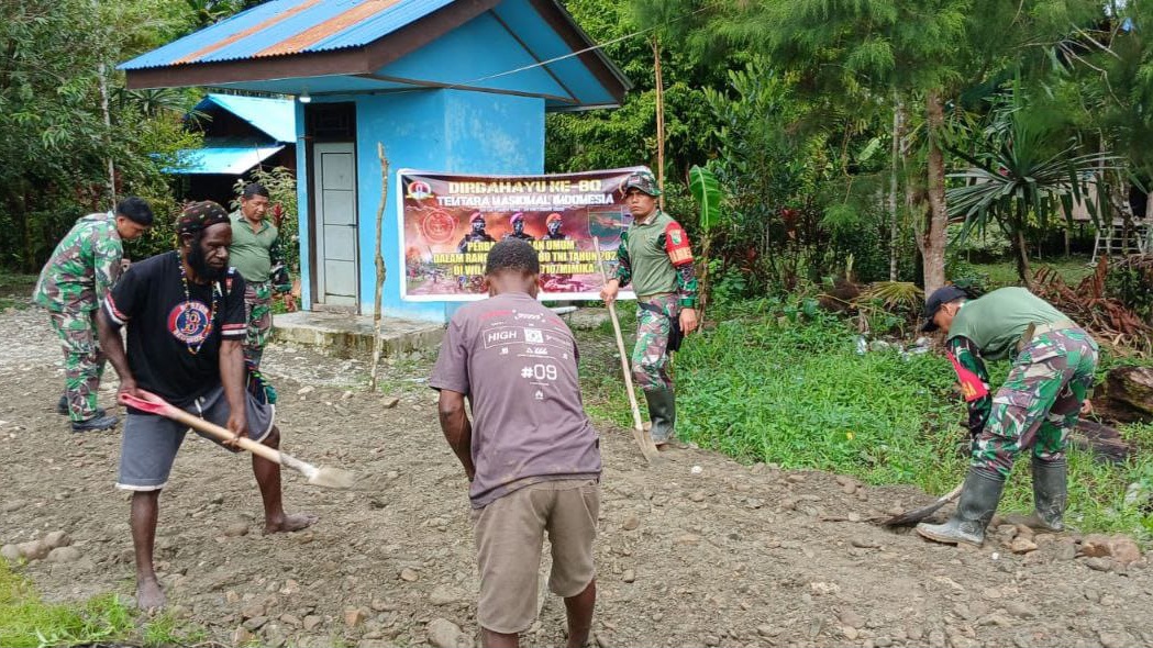 Wujud Bakti nyata sebagai satuan kewilayahan menjelang peringatan HUT ke-80 TNI tahun 2025, Kodim 1710/Mimika menyelengarakan kegiatan karya bakti perbaikan fasilitas umum berupa jalan masuk menuju Kp. Jimbi, Distrik Kuala Kencana, Kab. Mimika, Kamis (25/9/25).