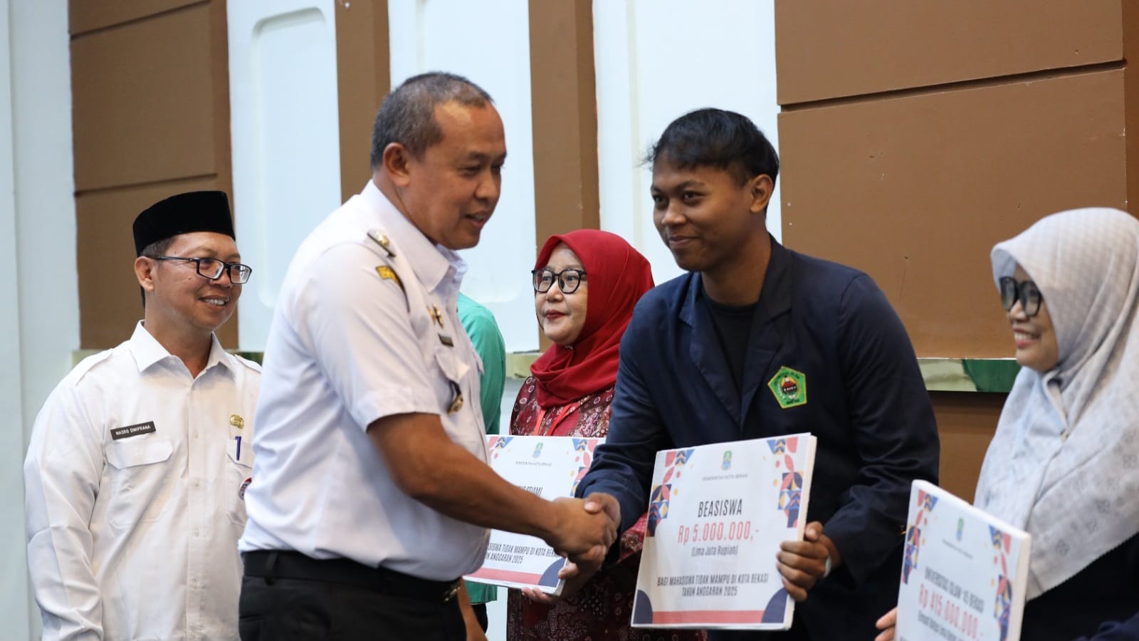 Wali Kota Bekasi Tri Adhianto menyerahkan secara simbolis bantuan beasiswa bagi 1.470 mahasiswa tidak mampu dari 77 perguruan tinggi se-Kota Bekasi. Penyerahan berlangsung di Gedung Graha Bintang, Mustikajaya, sebagai bagian dari komitmen pemerintah kota dalam memperluas akses pendidikan tinggi bagi masyarakat.