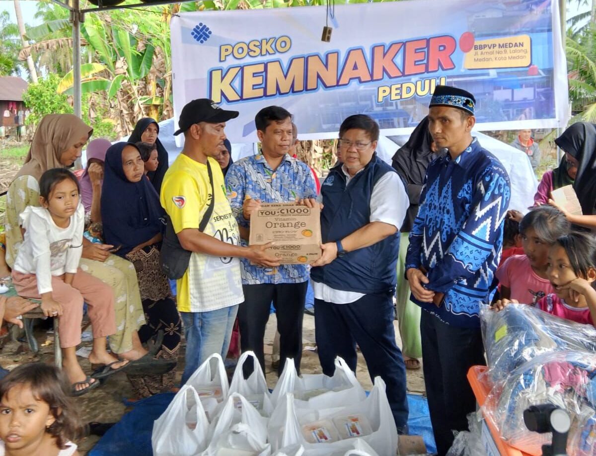 Penyerahan bantuan dilakukan secara simbolis oleh Ketua Tim Kemnaker Peduli, Sukro Muhab, di Dusun Mergat, Desa Pantai Cermin, Tanjung Pura, Kabupaten Langkat, Sumatera Utara. Bantuan yang disalurkan meliputi pakaian layak pakai, makanan siap saji, serta obat-obatan.