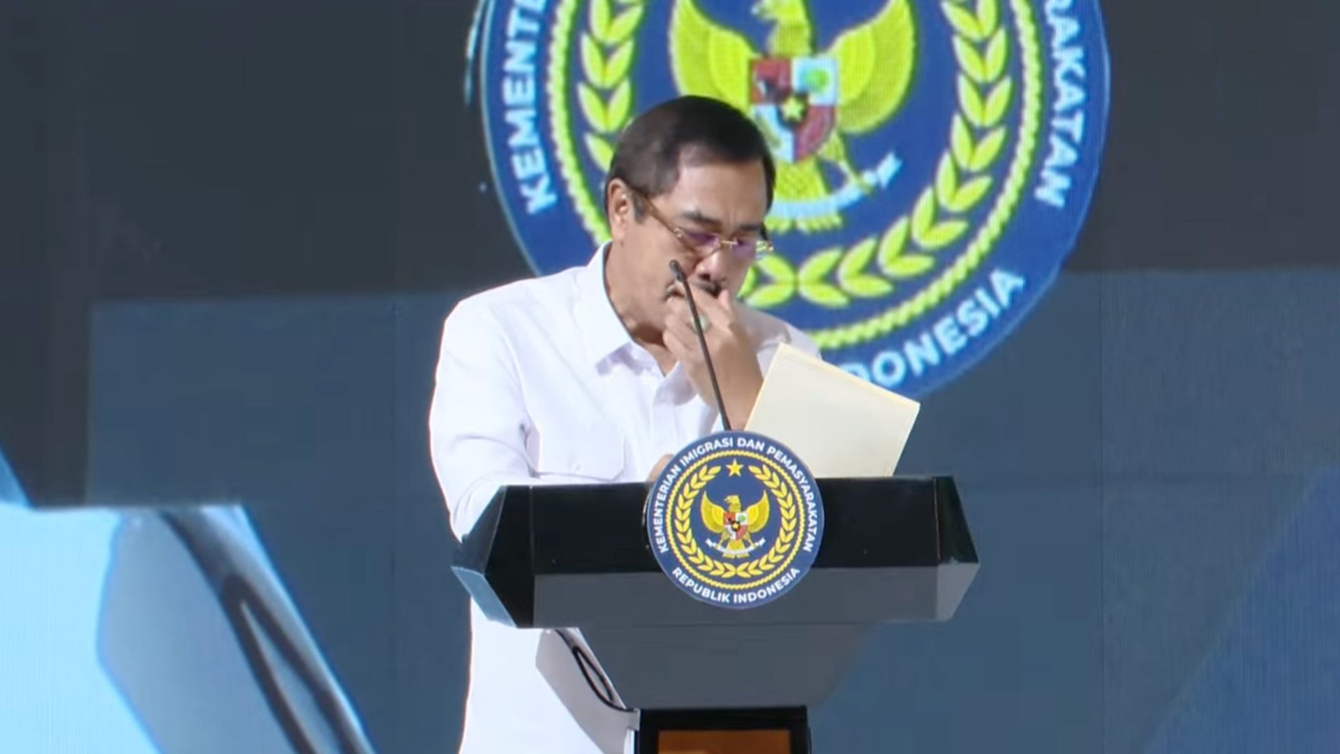Menteri Imigrasi dan Pemasyarakatan Agus Andrianto tak kuasa menahan haru saat memberikan arahan kepada jajaran Kementerian Imigrasi dan Pemasyarakatan (Kemenimipas) dalam penutupan Rapat Koordinasi Evaluasi dan Pengendalian Kinerja Tahun 2025, Selasa (16/12).