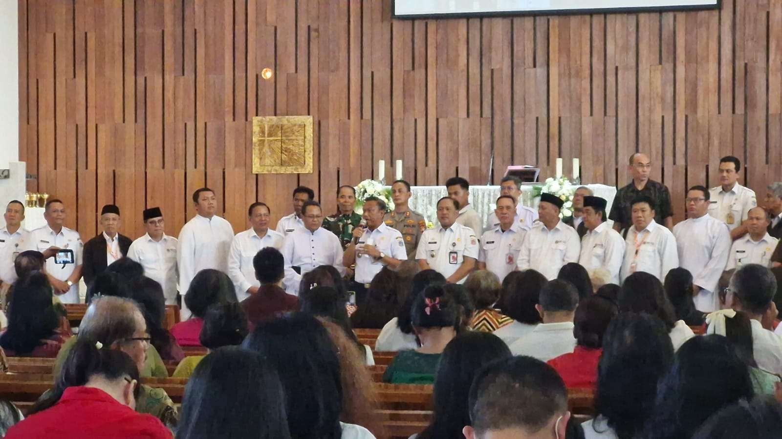 Di hadapan ribuan jemaat yang memadati ruang ibadah, Munjirin menyampaikan ucapan selamat Natal serta menegaskan komitmen pemerintah daerah bersama aparat keamanan dan masyarakat dalam menjaga kondusivitas selama perayaan berlangsung.