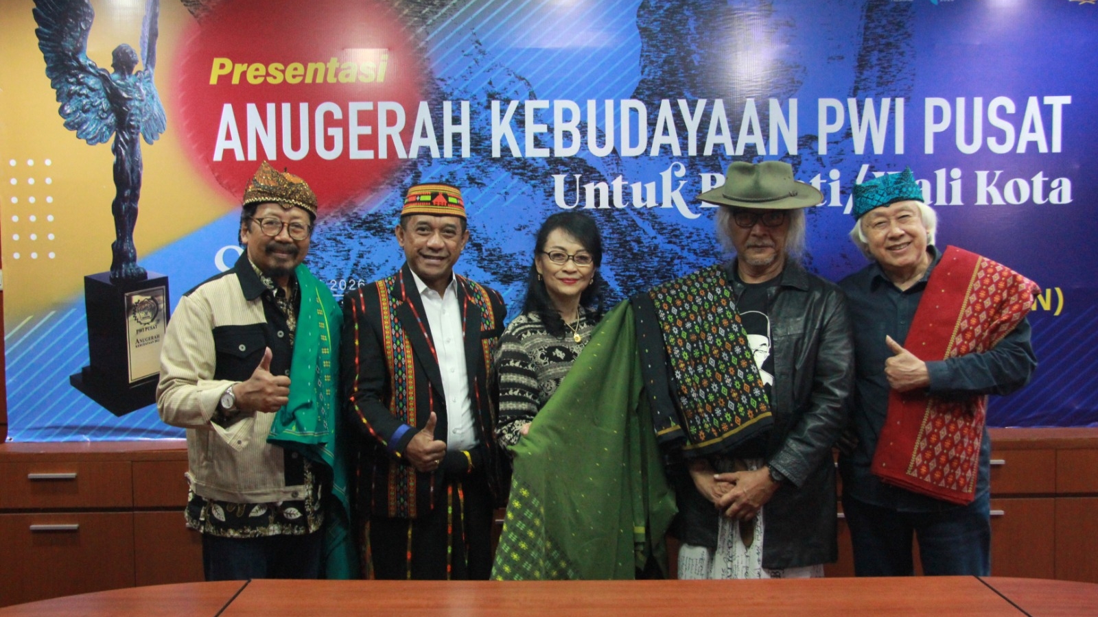 Tiga wali kota dan tujuh bupati berhasil mempertahankan proposalnya masing-masing di depan Dewan Juri Anugerah Kebudayaan (AK) PWI Pusat (9/1/2026). Tiga bupati diantaranya, presentasi melalui daring, karena pada saat itu yag bersangkutan tidak bisa meninggalkan daerahnya, karena harus memakamkan jenazah orang tuanya, kegiatan terkait penanganan bencana alam Sumatra, dan acara adat.