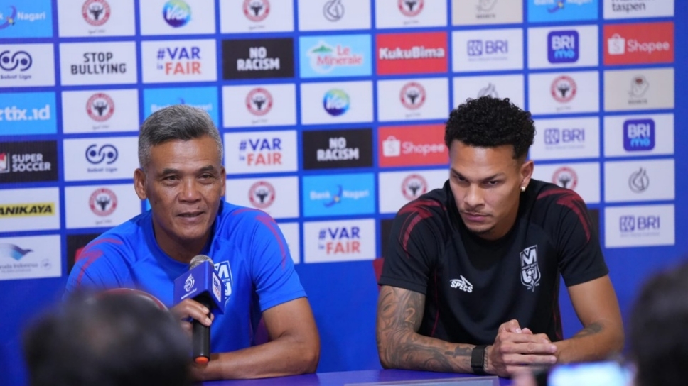 Pelatih Malut United Hendri Susilo (kiri) bersama salah satu pemain menghadiri konferensi pers jelang laga pekan ke-22 BRI Super League 2025/2026 melawan Semen Padang FC di Stadion H. Agus Salim.(Sumber: ileague.id)