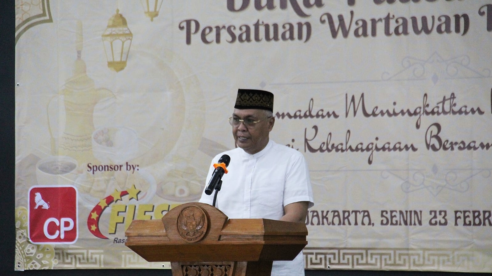 Persatuan Wartawan Indonesia (PWI) Pusat menggelar kegiatan Buka Puasa Bersama dan Santunan Yatim Piatu di Hall Dewan Pers, Jakarta Pusat, Senin (23/2/2026).