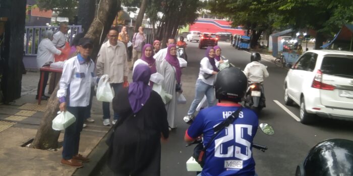 Sebanyak 150 nasi kotak dibagikan kepada para pengguna jalan dan masyarakat sekitar di pinggir jalan raya dekat Kampus Ungu IBM, pada Jumat (6/3/2026) menjelang waktu berbuka puasa.