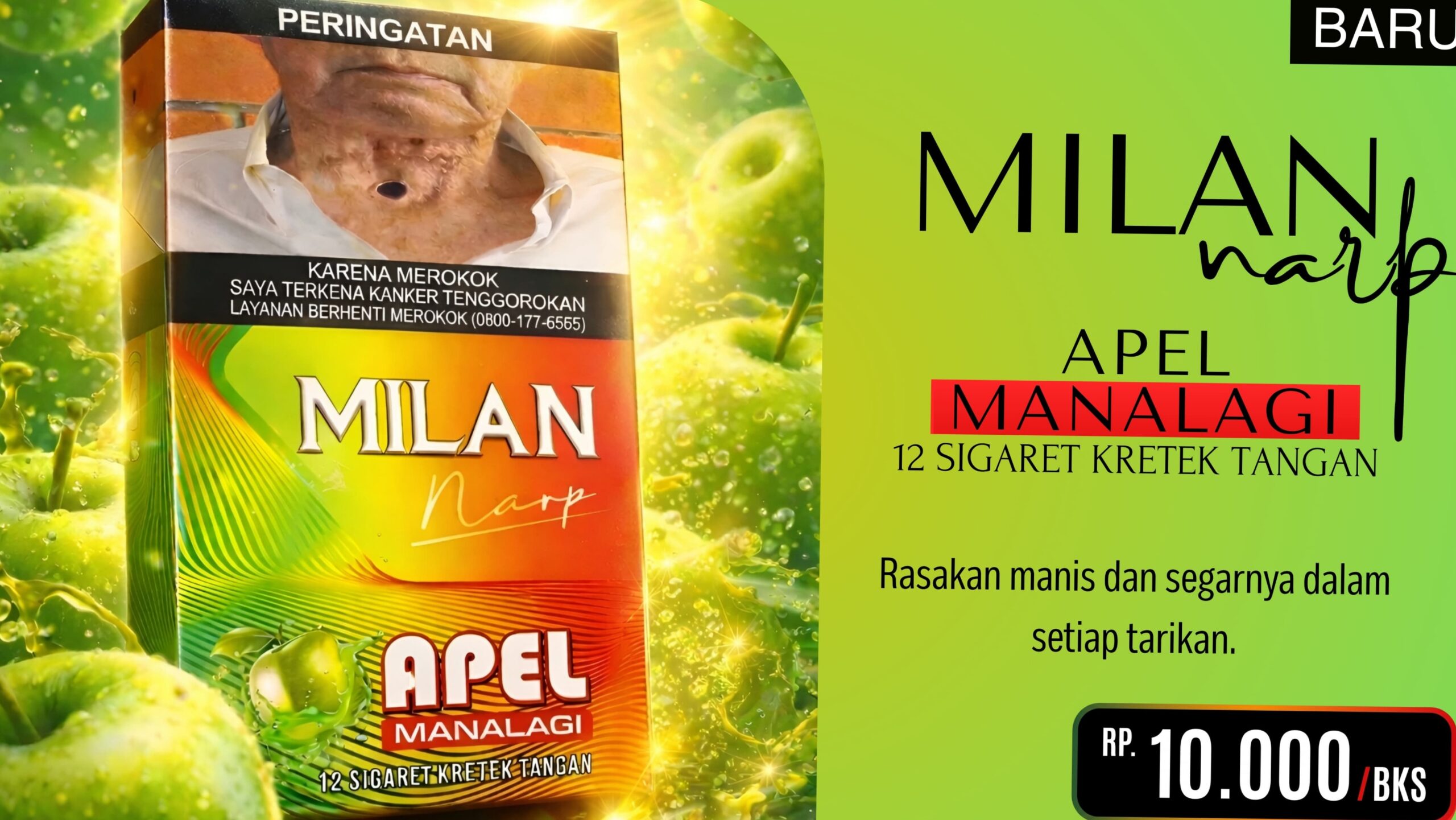 Varian pertama adalah Apel Manalagi, yang menghadirkan perpaduan aroma tembakau premium dengan kesegaran manis khas apel manalagi. Sensasi rasa manis yang lembut dan aroma yang aromatik memberikan pengalaman merokok yang ringan namun tetap berkarakter.