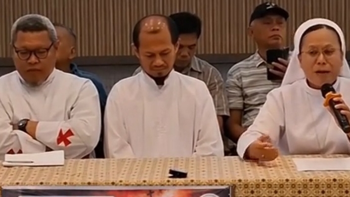 Tangis pecah dalam jumpa pers di Gereja Katedral Medan, Jumat (10/4/2026). Suster Natalia Situmorang mempertanyakan lemahnya pengawasan Bank Negara Indonesia (BNI) yang diduga membuat dana umat senilai Rp28 miliar hilang.