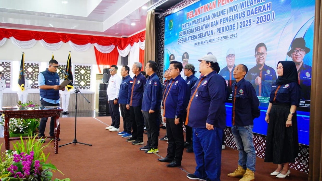 Panji organisasi Ikatan Wartawan Online (IWO) di bawah kepemimpinan H Teuku Yudhistira Adi Nugraha, M.I.Kom terus berkibar di seluruh tanah air. Setelah menuntaskan pelantikan di beberapa wilayah tengah dan timur, pada Jumat siang (17/4/2026) panji organisasi wadah wartawan online ini kembali berkibar di Sumatera Selatan (Sumsel) seiring dengan pelantikan secara kolektif kepengurusan Wilayah IWO Sumatera Selatan (Sumsel) beserta 5 Pengurus Daerah IWO se-Sumsel dalam kegiatan yang digelar di Pendopoan Rumah Dinas Bupati Musi Banyuasin (Muba).