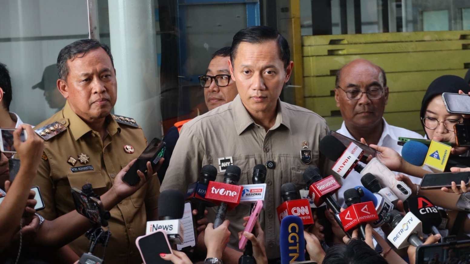 Menteri Koordinator Infrastruktur dan Pembangunan Kewilayahan Agus Harimurti Yudhoyono (AHY) didampingi Wali Kota Bekasi Tri Adhianto saat memberikan keterangan kepada sejumlah media nasional terkait penanganan dan evakuasi kecelakaan kereta di Bekasi.